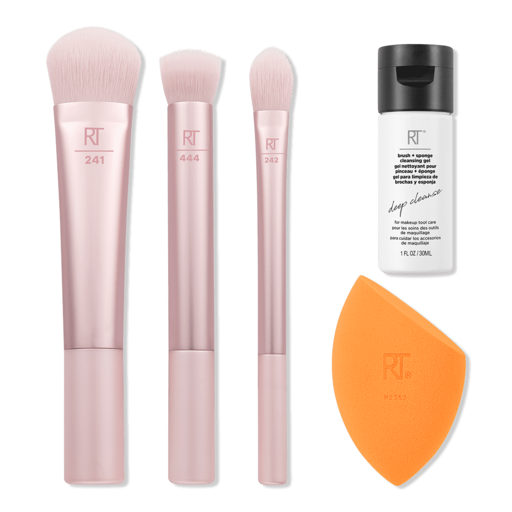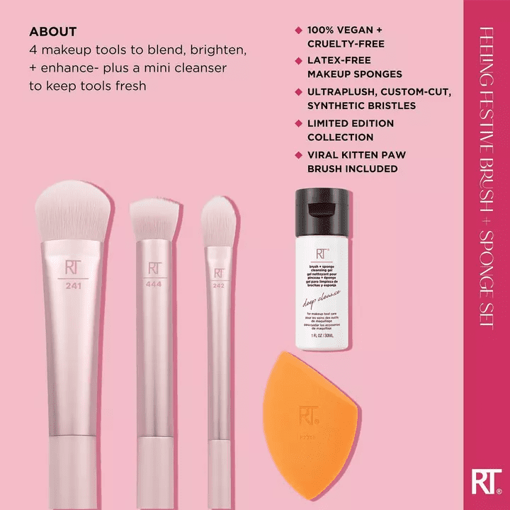 El juego de brochas y esponjas Feeling Festive de Real Techniques tiene 4 herramientas de maquillaje para difuminar, iluminar y realzar, además de un limpiador para mantener las herramientas frescas.