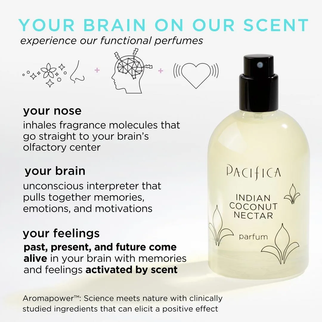 El perfume en aerosol Indian Coconut Nectar de Pacifica combina coco cremoso, vainilla, cristales de azúcar y ámbar resinoso en alcohol de grano natural para ayudar a estabilizar la mente. Sus fragancias funcionales, respaldadas por la neurociencia, son herramientas clave para su búsqueda del bienestar.