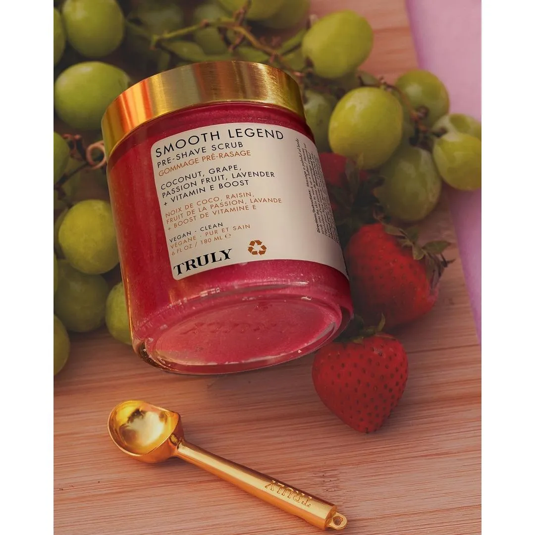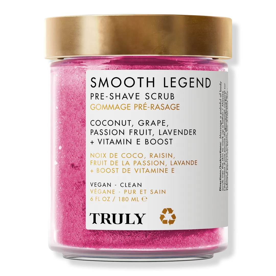 El exfoliante pre-afeitado Smooth Legend de Truly es un exfoliante ligero a base de azúcar que elimina las células cutáneas muertas y el olor corporal, afloja los folículos pilosos y elimina los productos que obstruyen los poros para revelar una piel brillante y luminosa. Úselo solo o antes del afeitado para lograr un afeitado súper sedoso y sin vellos encarnados.