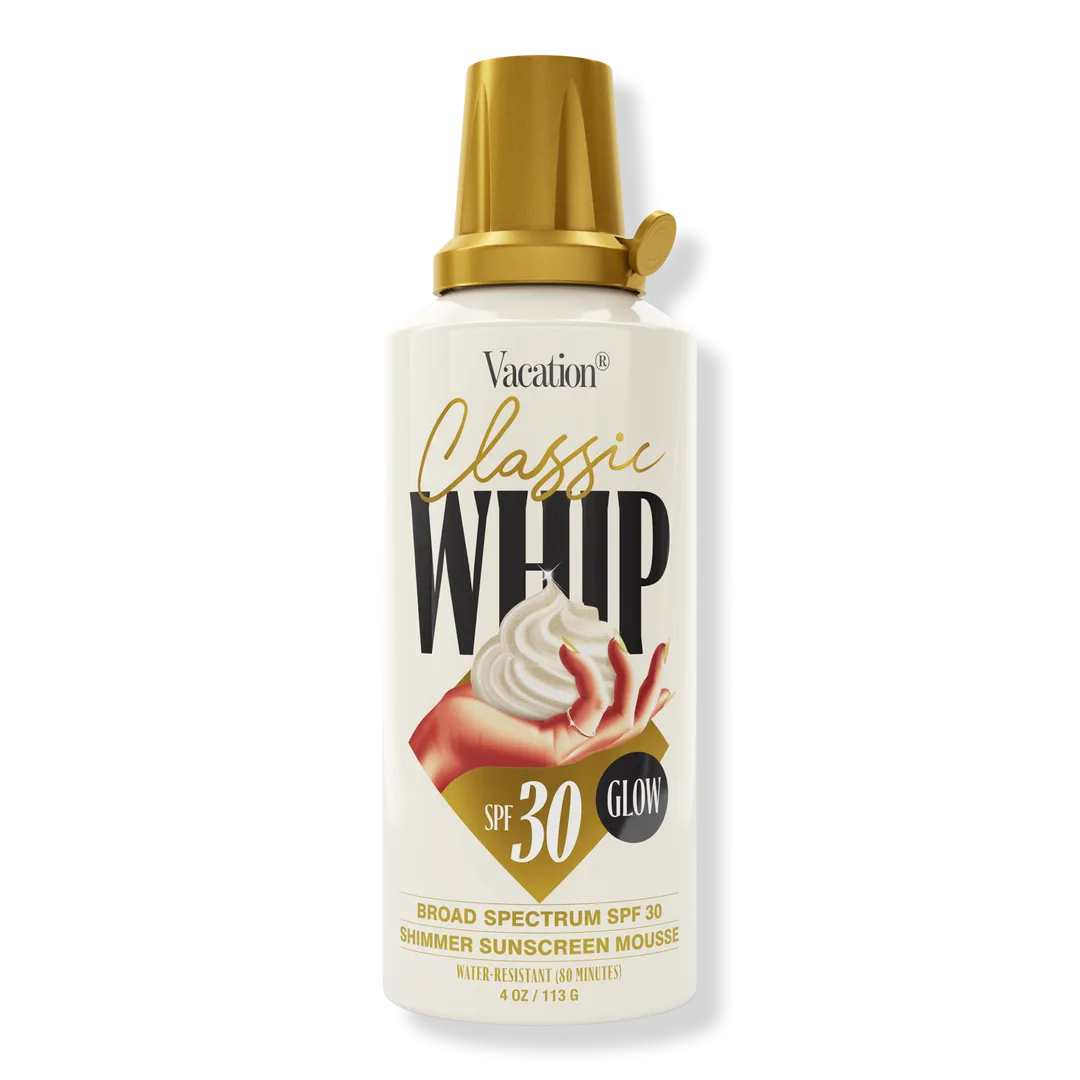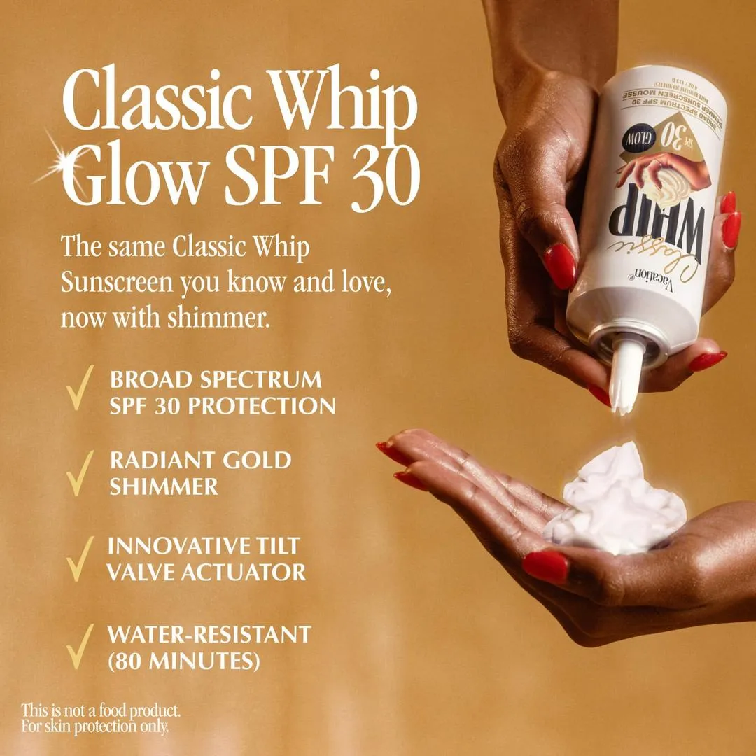 Vacation Classic Whip Glow FPS 30 es la versión brillante del protector solar Classic Whip que conoces y adoras. Disfruta de la misma crema estrellada y el mismo galardonado aroma característico, ahora con un radiante toque de brillo dorado.