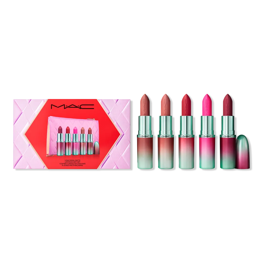 El kit Less is Bore Lip x5 es un set de labios para regalar, exclusivo para las fiestas, que incluye cinco tonos de lápiz labial sedoso mate M·A·Cximal de tamaño completo y los más vendidos en una bolsa de maquillaje violeta a un precio M·A·Cnificent.