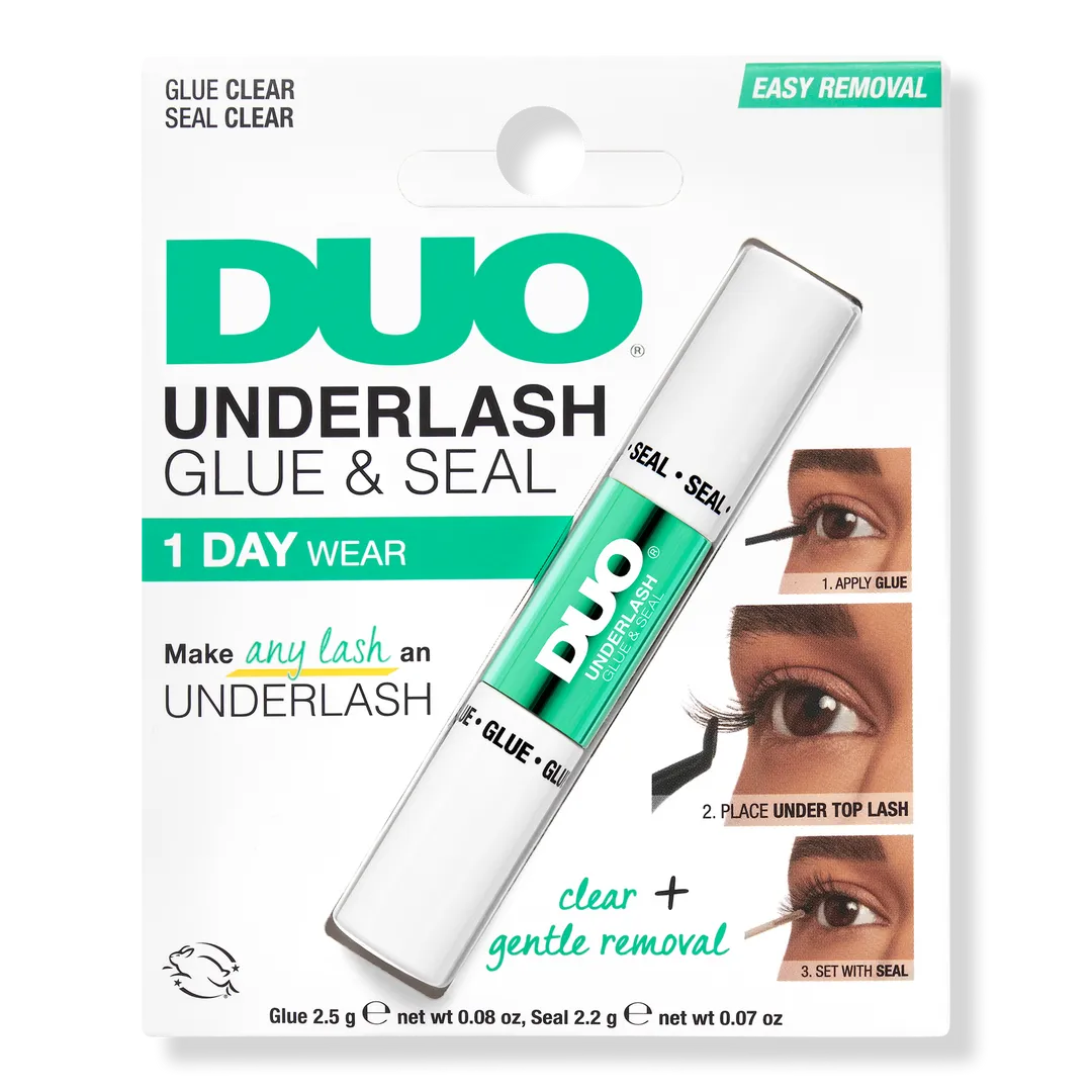 Duo Underlash Clear Glue & Seal es una fórmula potente pero suave que ofrece un uso seguro durante un día y cuidado con tres vitaminas. Su tubo de 2 pasos incluye Clear Glue para fijar las pestañas durante todo el día y Clear Seal para eliminar los residuos pegajosos, fijar y proteger. El aplicador se desliza como una máscara de pestañas para una aplicación precisa.