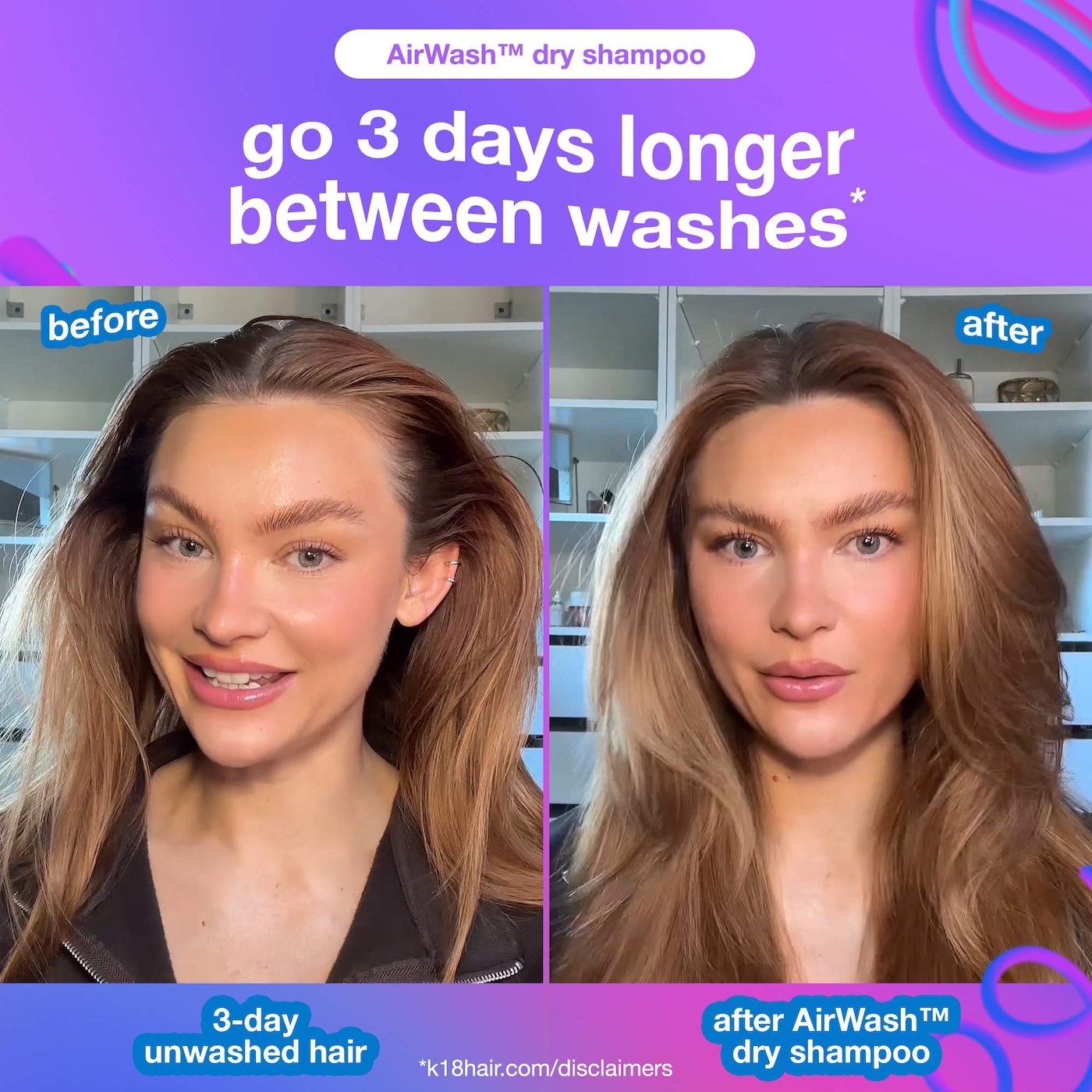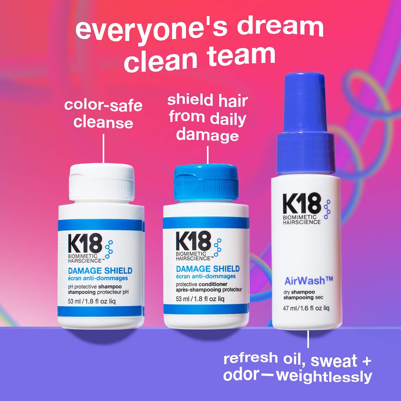 El champú y acondicionador DAMAGE SHIELD ayudan a prevenir daños, enredos, frizz y pérdida de color, a la vez que protegen contra los rayos UV, el daño ambiental y los daños mecánicos hasta por tres días. Enriquecido con el K18PEPTIDE™ patentado para fortalecer el cabello durante el lavado. El champú seco AirWash™ está clínicamente probado para eliminar el mal olor y reducir la grasa y el sudor hasta por tres días. Este champú seco utiliza la biotecnología patentada odorBIND™ de liberación inteligente que detecta y elimina clínicamente los malos olores. Sus microperlas translúcidas absorben el exceso de grasa sin dejar residuos almidonados ni una capa blanca.
