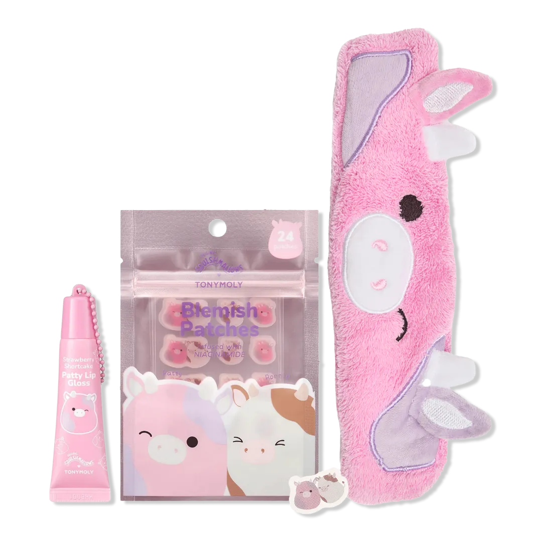 ¡Relájate con Patty! El paquete de cuidado personal TONYMOLY x Squishmallows Perfectly Pink Patty incluye 24 parches para imperfecciones, una suave diadema de felpa y un delicioso brillo labial de fresa. ¡La forma más adorable de consentirte y un regalo perfecto!