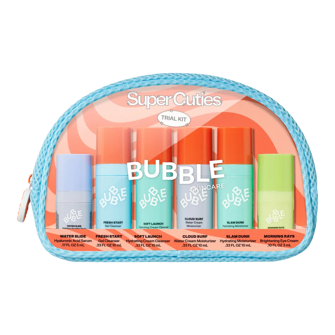 El kit de prueba Super Cuties contiene seis miniburbujas que cambian el rostro. Juntas forman una rutina refrescante que fortalece la barrera de protección y te ayudará a afrontar el día en casa o mientras estás fuera.