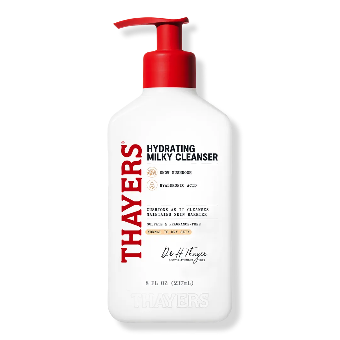 El limpiador facial hidratante lechoso Thayers con hongo de nieve y ácido hialurónico hidrata inmediatamente mientras elimina el maquillaje, la suciedad, la grasa y las impurezas sin alterar la barrera cutánea.